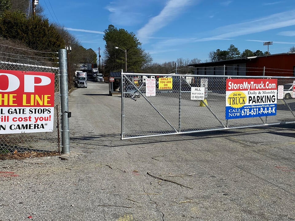 Our high-security truck stop parking lot in Atlanta is protected by an elctronic gate entry & exit. One of our trained security guards is stationed at the gate at all times. This ensures that no one gets in or out without our knowledge and helps us to keep your vehicle safe. For the safest truck driver parking in Atlanta, park with us! Spaces are available!